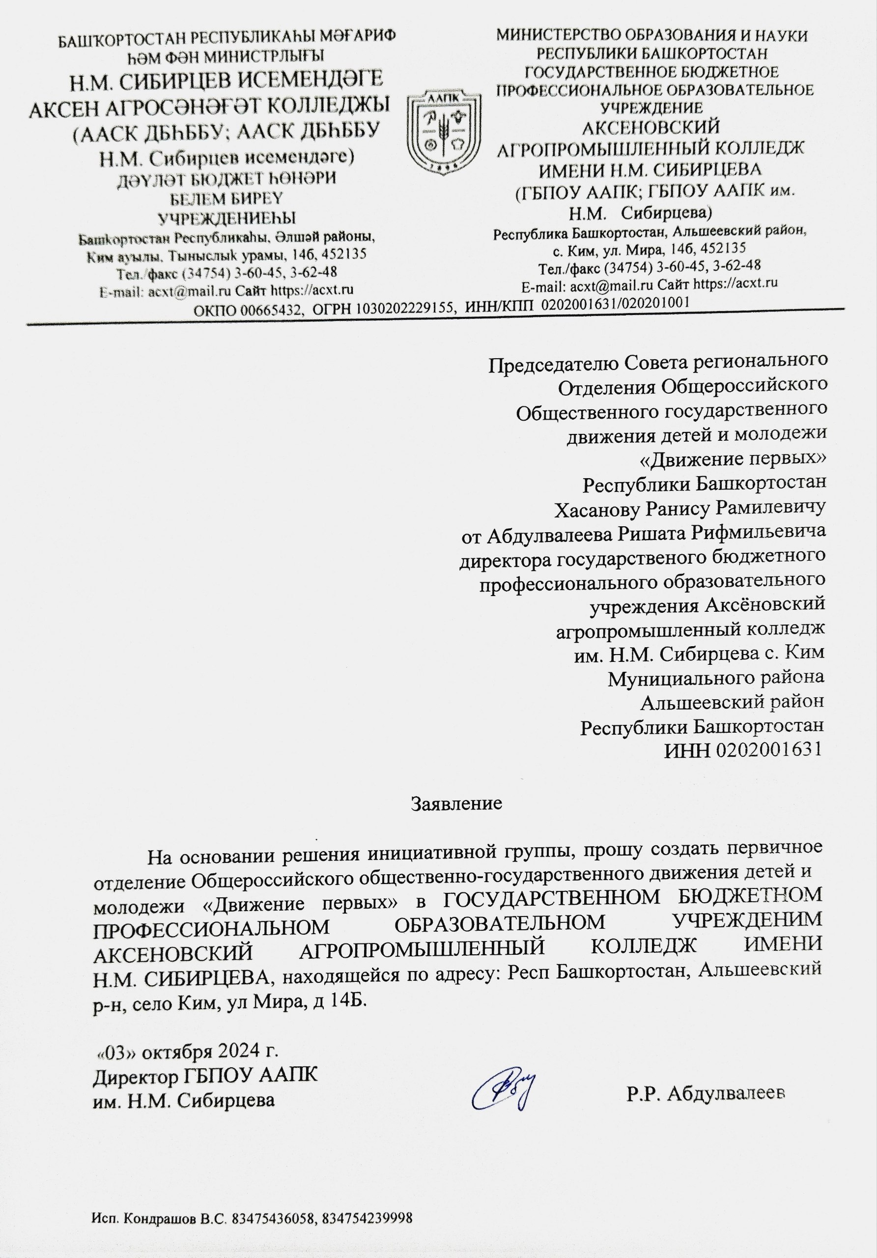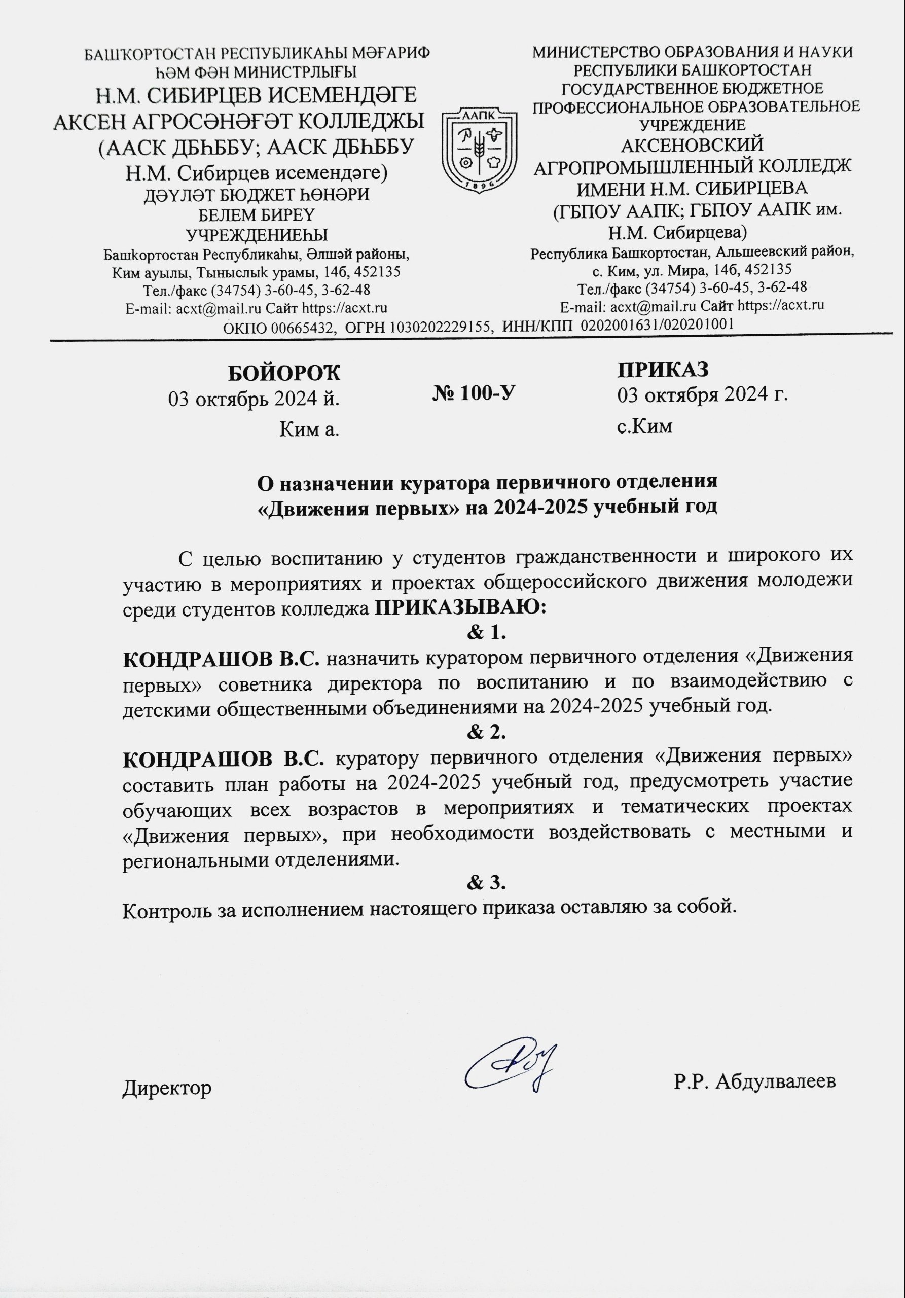 КОНДРАШОВ В.С. – СОВЕТНИК ДИРЕКТОРА ПО ВОСПИТАТЕЛЬНОЙ РАБОТЕ И ВЗАИМОДЕЙСТВИЮ С ДЕТСКИМИ ОБЩЕСТВЕННЫМИ ОБЪЕДИНЕНИЯМИ ГБПОУ ААПК ИМ. Н.М. СИБИРЦЕВА ЗАЯВЛЕНИЕ НА СОЗДАНИЕ ПЕРВИЧНОГО ОТДЕЛЕНИЯ ДВИЖЕНИЯ ПЕРВЫХСкачать ПРОТОКОЛ СОЗДАНИЯ ПЕРВИЧНОГО ОТДЕЛЕНИЯ ДВИЖЕНИЯ ПЕРВЫХСкачать ПРИКАЗ О НАЗНАЧЕНИИ КУРАТОРА ПЕРВИЧНОГО ОТДЕЛЕНИЯ ДВИЖЕНИЯ ПЕРВЫХСкачать ПЛАН СОВЕТНИКА ДИРЕКТОРА ПО ВОСПИТАТЕЛЬНОЙ РАБОТЕ 2024-2025 ГОДСкачать ПЛАН ПЕРВИЧНОГО ОТДЕЛЕНИЯ ДВИЖЕНИЯ ПЕРВЫХ ГБПОУ ААПК ИМ. Н.М. СИБИРЦЕВА 2025-2026 Г.Скачать ПЛАН РАБОТЫ СОВЕТНИКА ДИРЕКТОРА ПО ВОСПИТАТЕЛЬНОЙ РАБОТЕ ГБПОУ ААПК ИМ. Н.М. СИБИРЦЕВА 2025-2026 УЧ. ГОД.Скачать ОБСУЖДЕНИЯ ВОПРОСОВ ДВИЖЕНИЯ ПЕРВЫХ РАБОЧЕЕ СОБРАНИЕ ДВИЖЕНИЯ ПЕРВЫХ